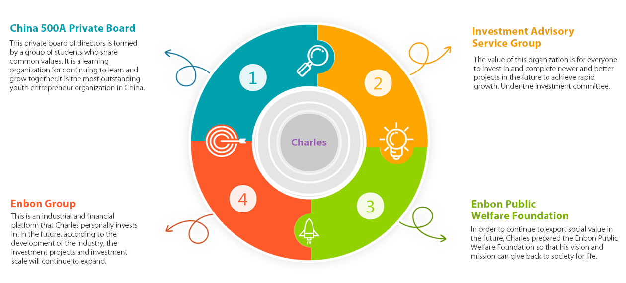 Группа Enbon - это интегрированная организация в области промышленности и финансов, основанная Чарльзом. Ее цель - разработка инвестиционных планов, основанных на текущем состоянии развития отрасли и требованиях развивающегося рынка и предприятия, а также создание более строгой и устойчивой групповой организации, которая также является инвестиционной платформой.